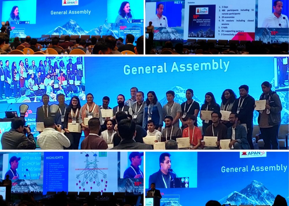 The General Assembly marked the final session of APAN55, during which several important announcements were made. One such announcement was the official appointment of Liana Jacinta as the new General Manager of APAN. Rajan Parajuli from the Nepal Research and Education Network gave a brief overview of the conference and its origins, and also shared how they planned to host the first in-person and online APAN meeting, post-pandemic. Additionally, the APAN55 fellows were presented with certificates during the General Assembly. Finally, the hosts of the next meeting, APAN56, were invited onto the stage to launch the event, which is scheduled to be held in Sri Lanka from August 21st to 25th 2023!