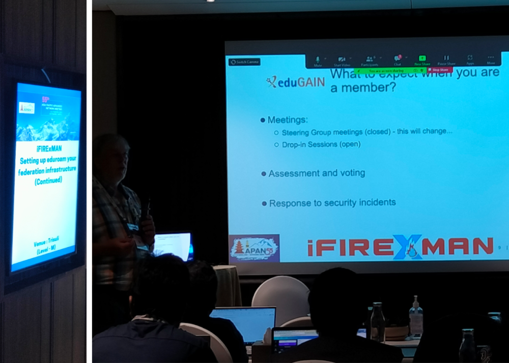 During day 2, I attended the session “iFIRExMAN - Setting up eduroam in your federation infrastructure” again, which was hosted by Irfan Hakim and Muhammad Farhan Sjaugi from Malaysia. This session was followed by a talk by Terry Smith from Australia on “iFIRExMAN - Joining eduGAIN”. The latter session discussed eduGAIN, which is a federation of federations providing access to millions of identities and thousands of services. I learned that connecting a federation to eduGAIN could encourage universities and research institutions to join the federation. Terry Smith’s talk covered the process of joining eduGAIN, its benefits, expectations from members, and the potential challenges that one may encounter.