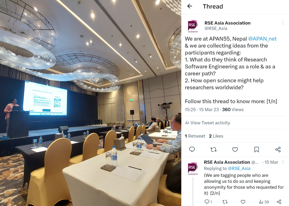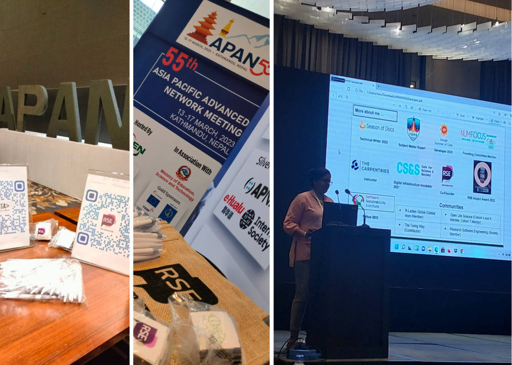 During day 3 of the event, I gave a presentation entitled “Research Software Engineering (RSE) Asia Association: Journey and Future Plans” at the “Open and Sharing Data Working Group (OSDWG): Asia Pacific Open-Sharing Data and NRENs Open Science” session. Mehul Raval also gave a presentation on initiatives for open data creation and sharing at Ahmedabad University, and Markus Buchhorm from Australia spoke about implementing good practices from Australian Open Science in the APAN community. Additionally, I shared swag for the RSE Asia Association and the Open Life Science programme, which were sponsored by the Open Life Science programme. During the session, I also conducted a task in which participants were asked to share their ideas on Research Software Engineering as a career path and how open science could benefit researchers globally. I collected the responses and compiled them into a Twitter thread, tagging those who gave permission and maintaining anonymity for those who requested it. Later, I attended the IAM Task Force - eduGAIN Steering Group meeting, which was led by Terry Smith.