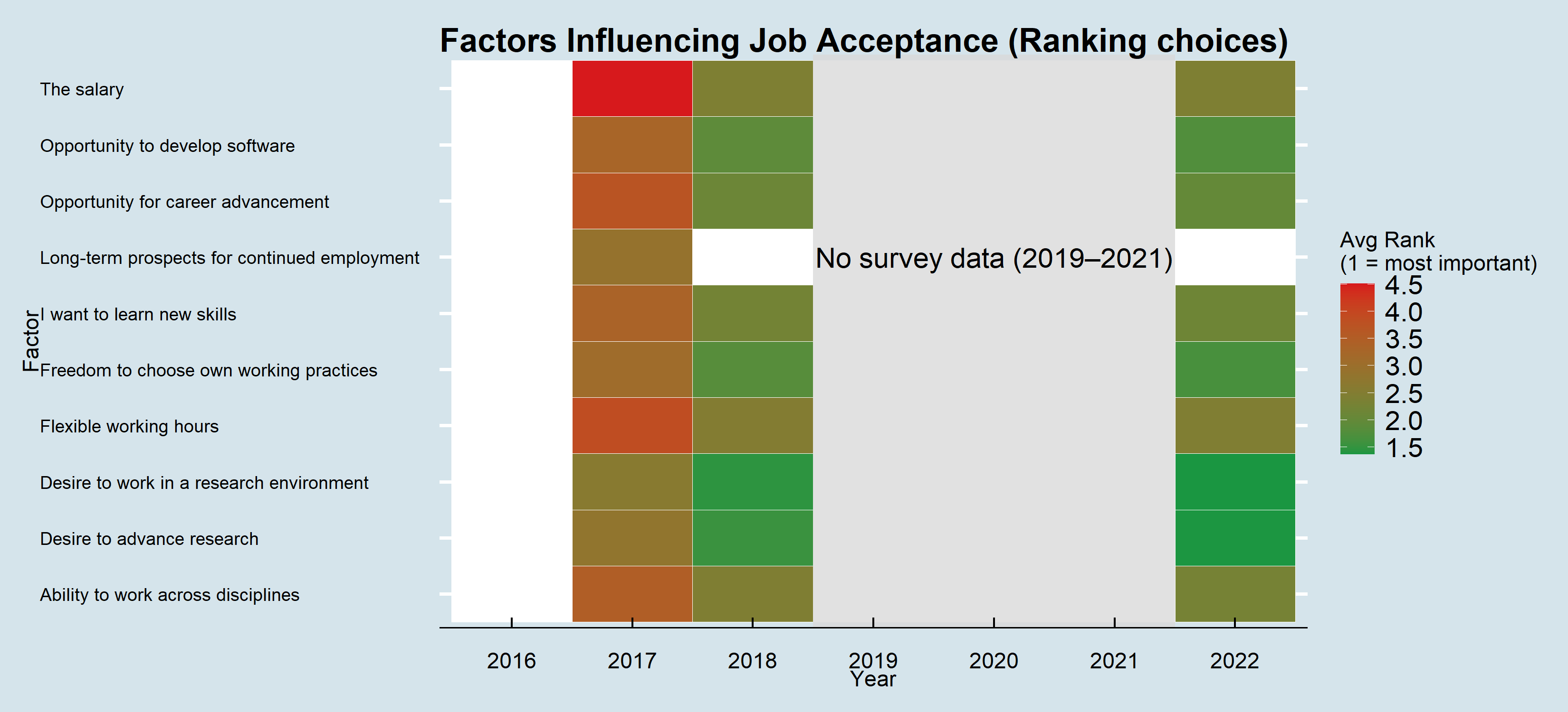 - This code contains the responses to the survey question: Rank the following factors dependent on how strongly they influenced your decision to accept your current position.
