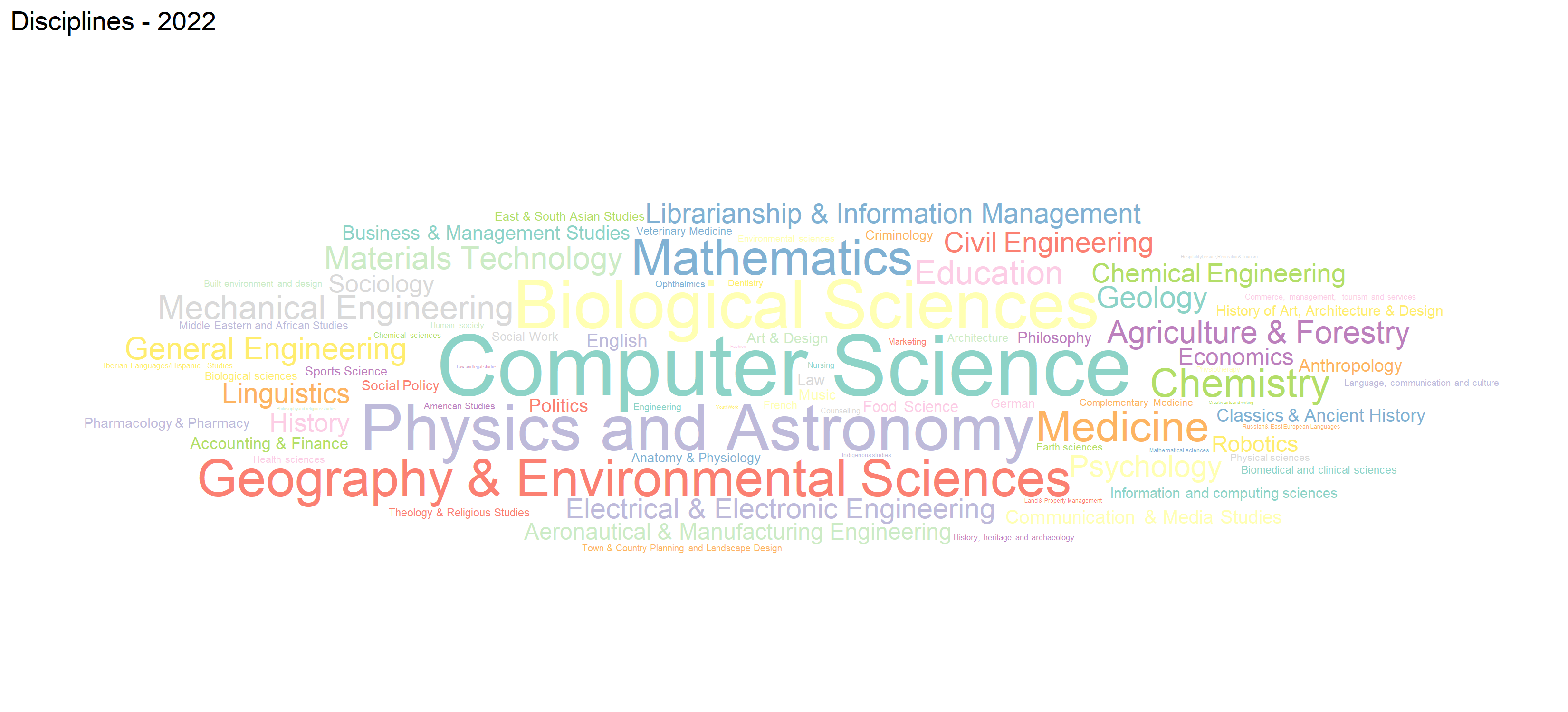 In 2022, some of the most popular disciplines where RSEs worked included Computer Science, Geography and Environmental Science, Physics and Astronomy, Mathematics, to name a few. This reflects the diversity of the RSE community and the wide range of research areas where RSEs contribute. The word cloud also shows that there are many other disciplines where RSEs work, indicating the interdisciplinary nature of RSE roles.