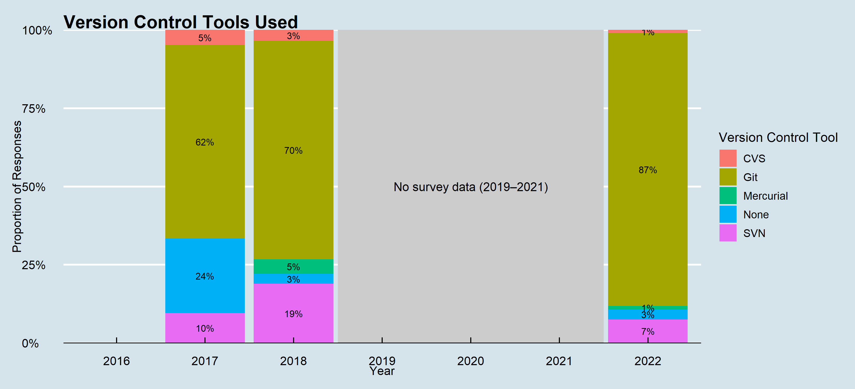 In 2017, 24% of the respondents reported of not using version control tools which reduced to 3% in 2022. The most popular version control tool being Git, with approximately 87% (in 2022) responses.