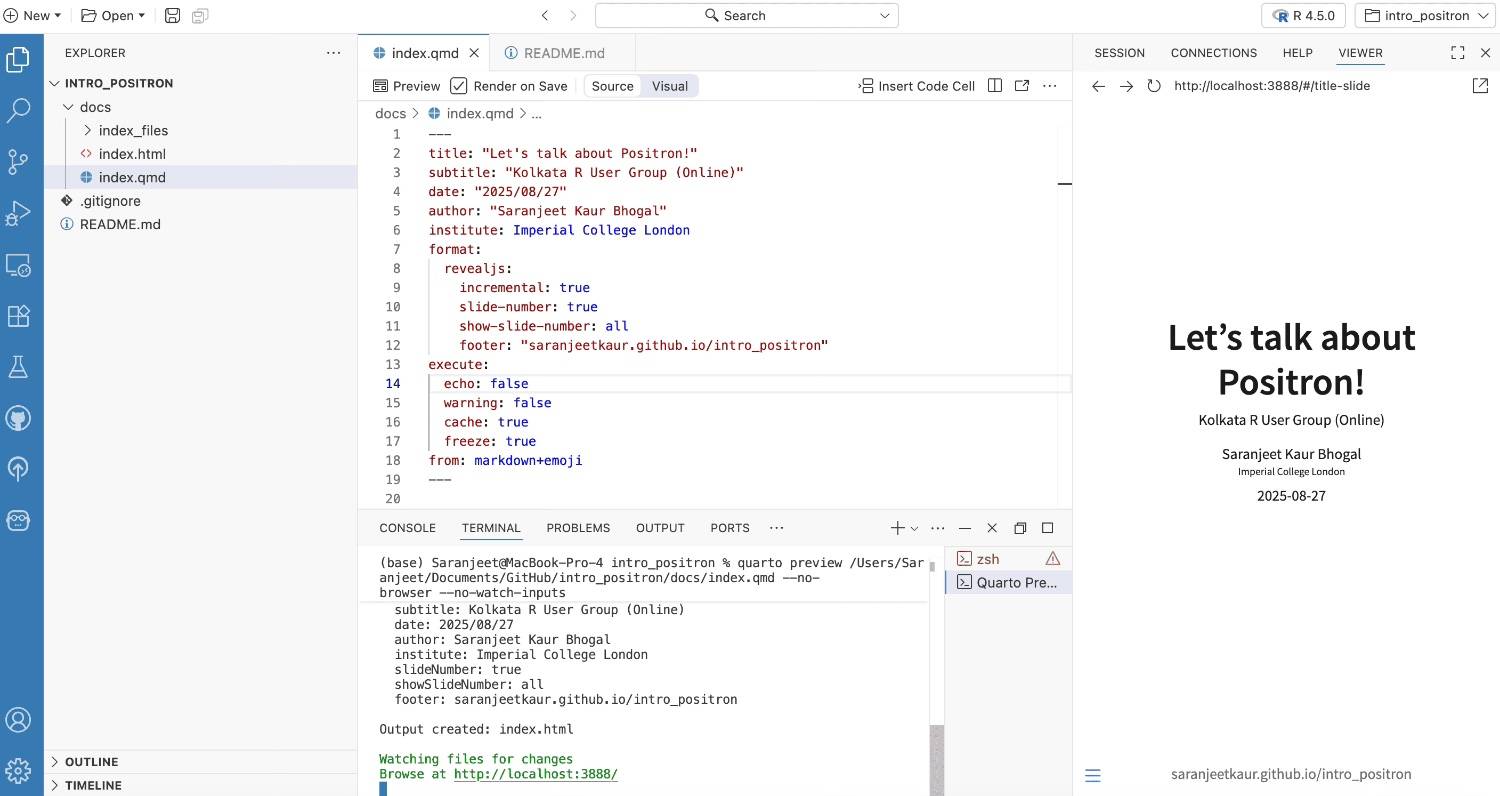 - Slides made using quarto in Positron